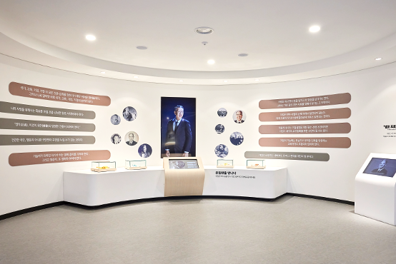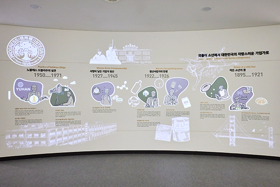 유일한 박사의 시기별 주요 사건들을 소개하는 벽면 오브제 전시