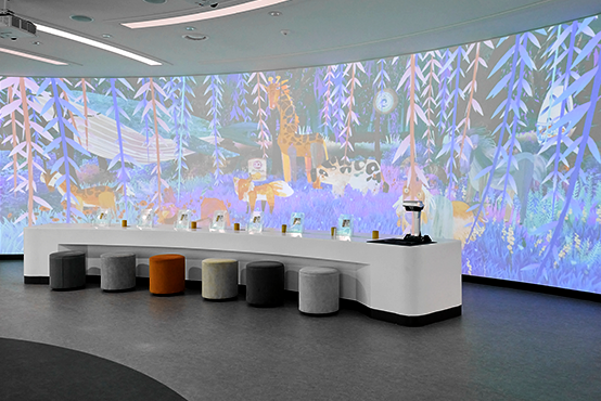 유한양행을 대표하는 버드나무 숲을 모션 그래픽으로 표현하여 유일한 박사의 생명존중 정신을 반영한 신비한 숲에서 다양한 동물들과 유한양행 대표 제품들이 어우러져 유일한 박사의 이야기를 관람객에게 흥미롭게 전달합니다.